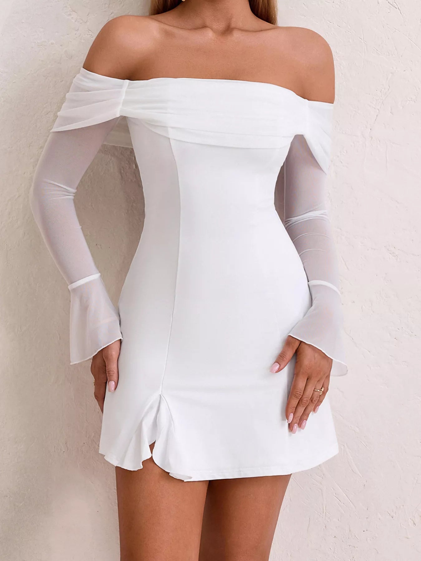 This off-the-shoulder mini dress features elegant long sleeves and a romantic neckline. Perfect for date nights and cocktail events, it combines contemporary style with refined sophistication.