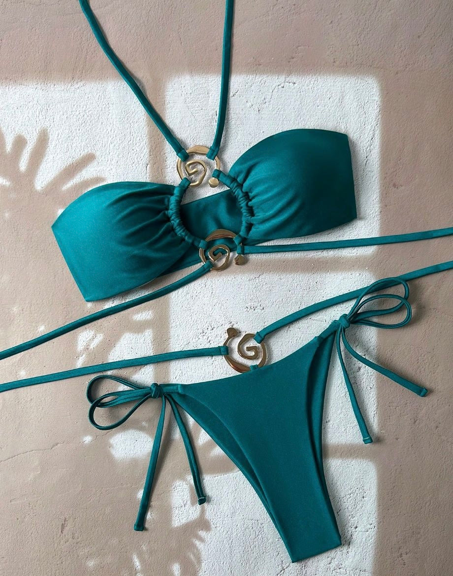 Bold, captivating, and unapologetically glamorous — the Selena bikini is designed to turn heads. Featuring luxurious gold-tone accents, daring cut-outs, and a seductive wraparound silhouette, this show-stopping piece sculpts your curves while offering a flattering, high-fashion edge. Crafted in a mesmerizing deep teal shade, Selena is perfect for luxury vacations, yacht days, and exclusive beach clubs where you want to feel powerful, sexy, and unforgettable.