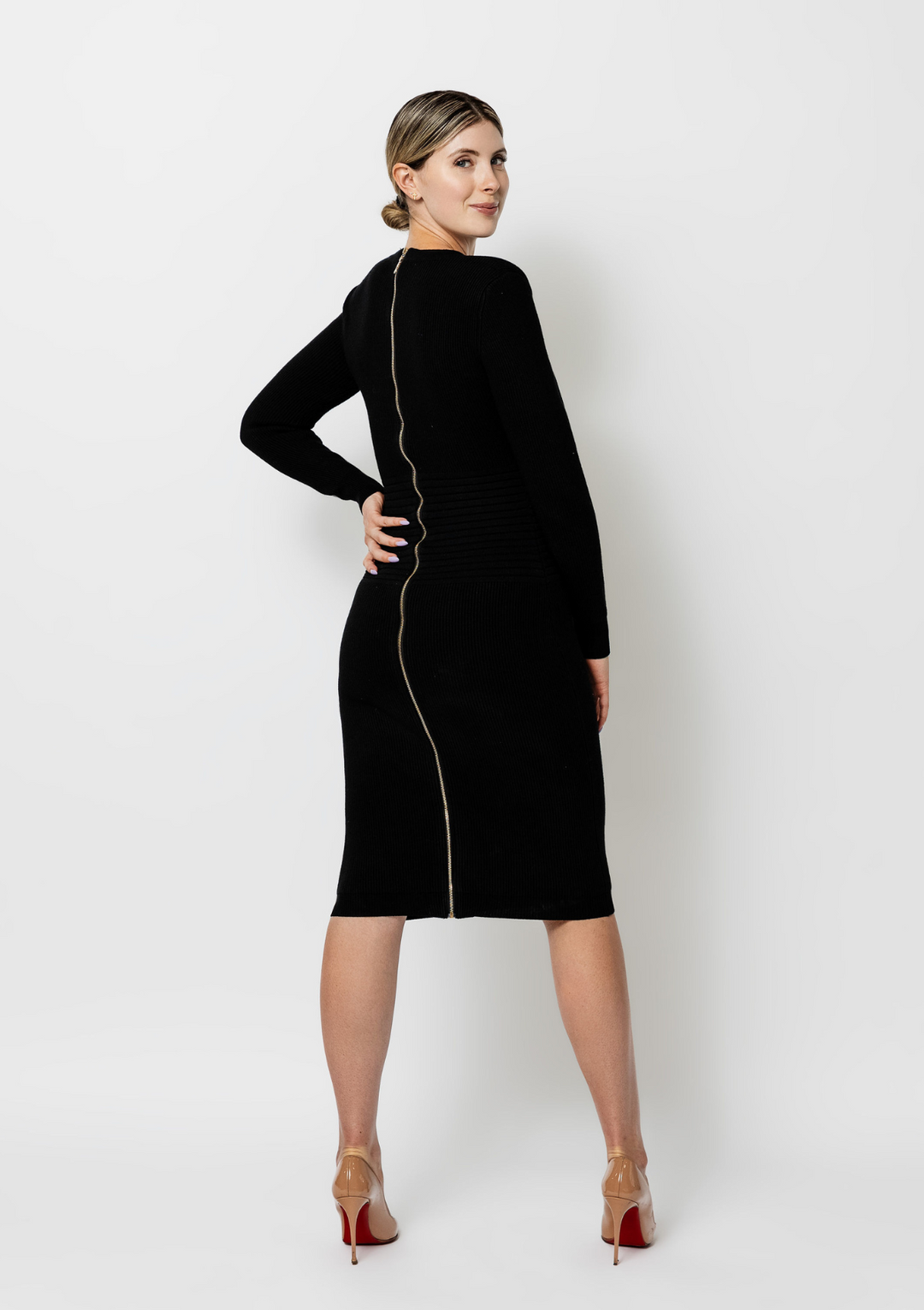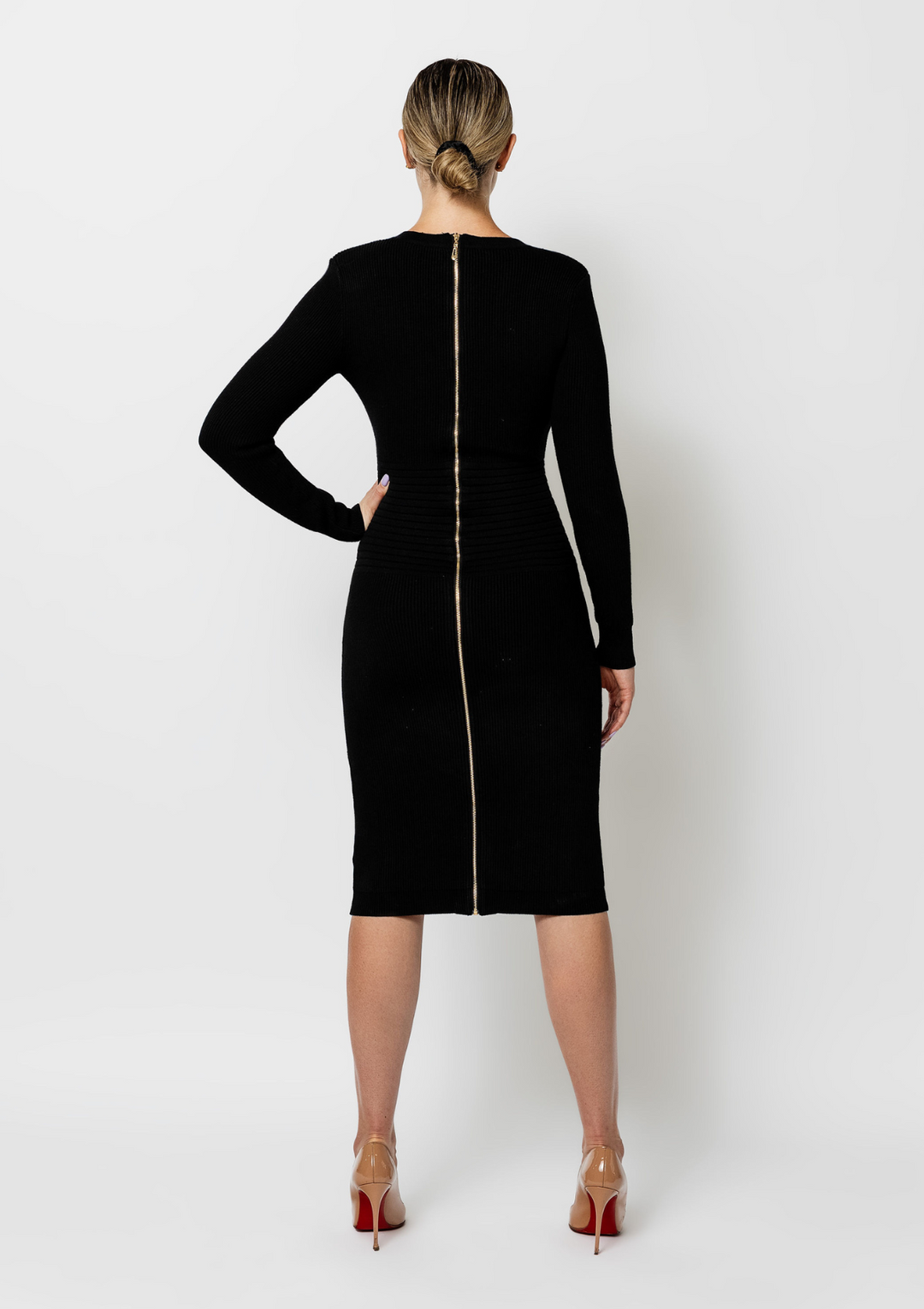 Luxurious and refined the 'Veronica Long Sleeve Knit Dress In Baby Back' is all things glamorous. Every detail down to the meticulously angled premium knit design has been carefully thought out. Form fitting long sleeves, beautiful V bust line and premium gold zipper all the way up the back. This bodycon dress features shiny gold buttons for a touch of decadence. Pair this style with a nude pump or strappy heels for a bit of spice.