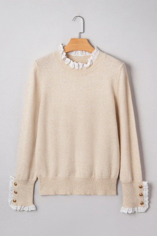 Effortless elegance meets everyday comfort in the Cindy Lace Accent Cuff Sweater. Crafted from a luxurious knit blend, this pullover features delicate lace accents and signature ribbed cuffs finished with gold-tone buttons—refined details that elevate any ensemble. Soft, breathable, and designed to move with you.