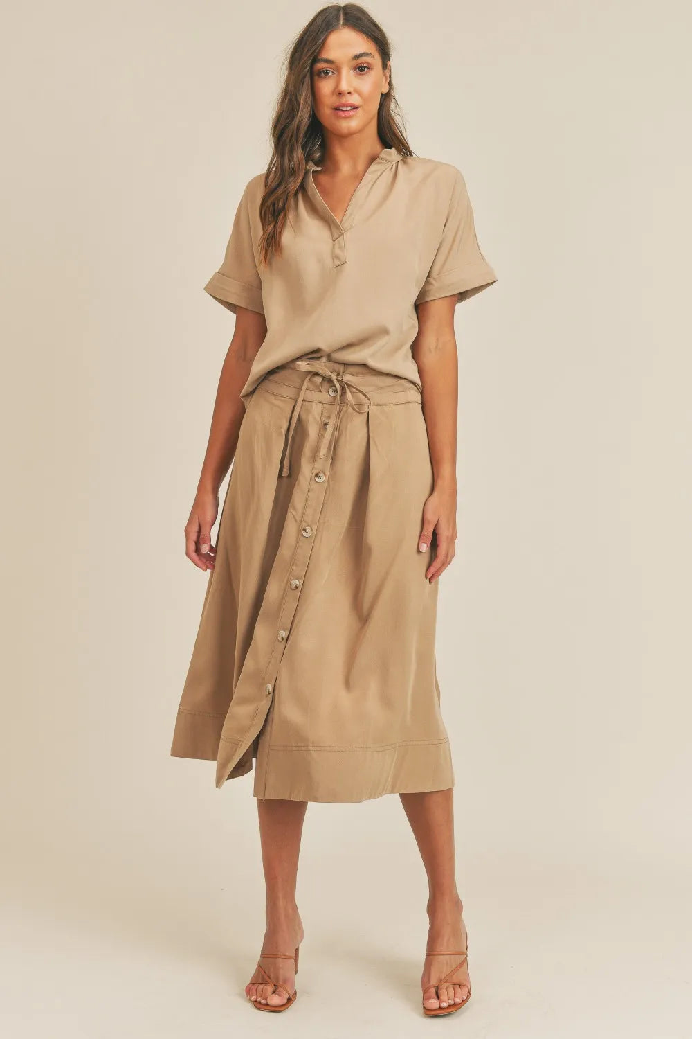 Carrie Short Sleeve Top and Midi Skirt Set In Taupe