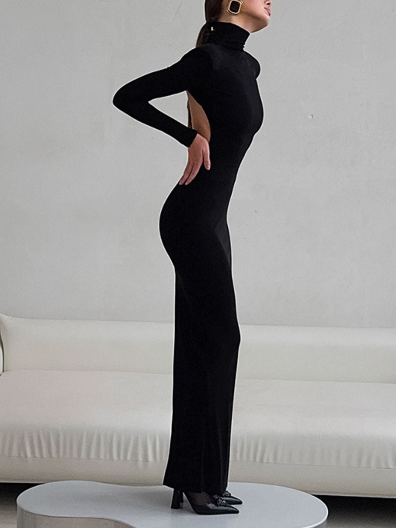Sleek and striking, this backless turtleneck maxi dress sculpts the body with a confident, elongated silhouette. Crafted in a smooth, slightly stretchy blend, it hugs in all the right places while the long sleeves and high neckline balance the daring open back. Finish with heels and a statement clutch for instant after-dark elegance.