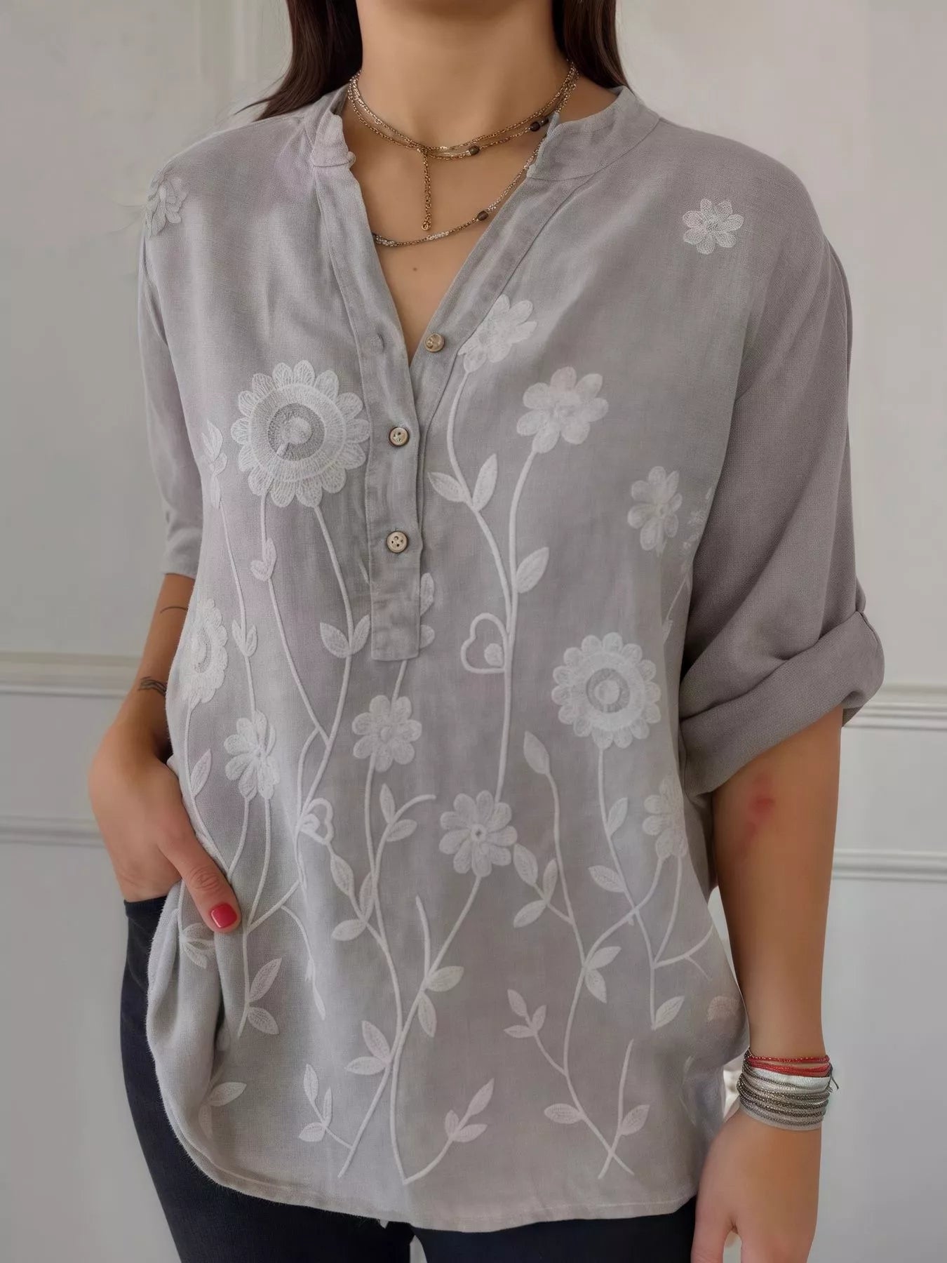Athena Floral Embroidered Button Detail Blouse