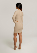 Gardez-le chic, doux et neutre dans la 'Mariah Deep-V Chain Long Sleeve Dress'. De délicates chaînes dorées qui s'entrecroisent créent votre décolleté idéal . Fabriqué à partir d'un magnifique tissu de bandage en rayonne nude de haute qualité, ce style consiste à modeler le corps tout en améliorant vos courbes naturelles. Mettez en valeur votre silhouette avec des manches longues sur mesure et un buste orné tout en accentuant la jambe.