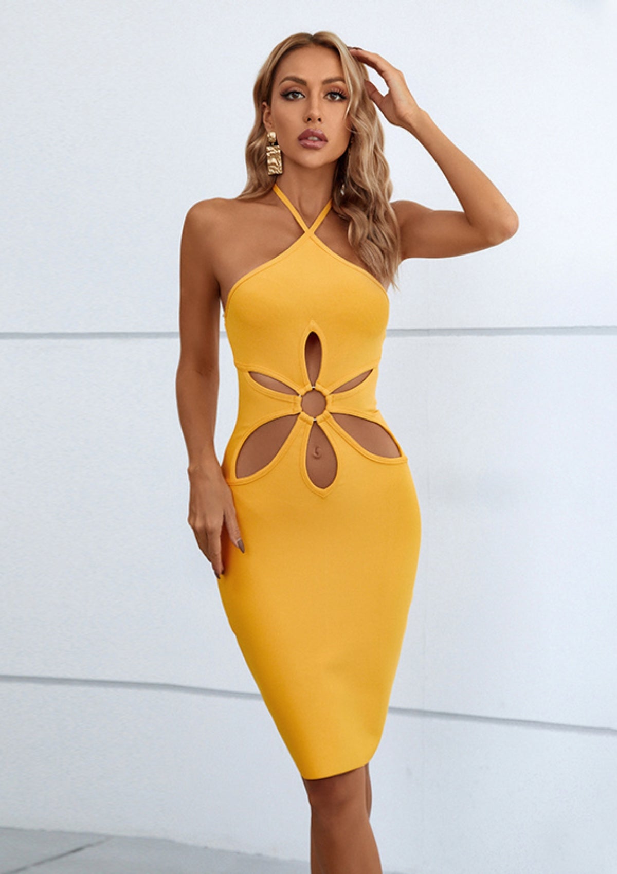 Samantha Flower Cut Out Halter Dress In Yellow - Vanity Couture