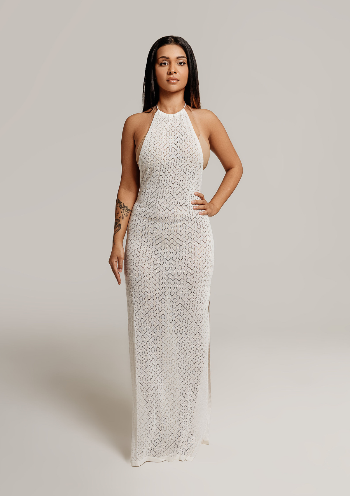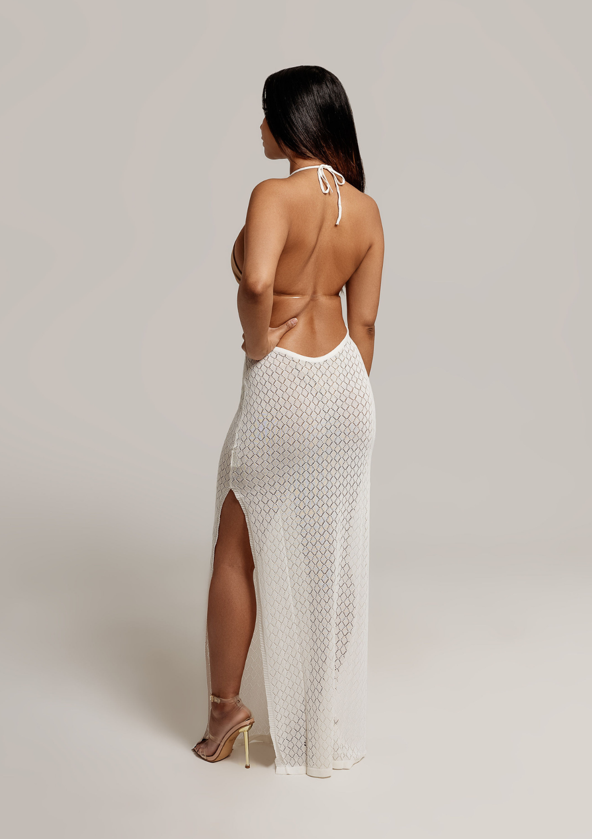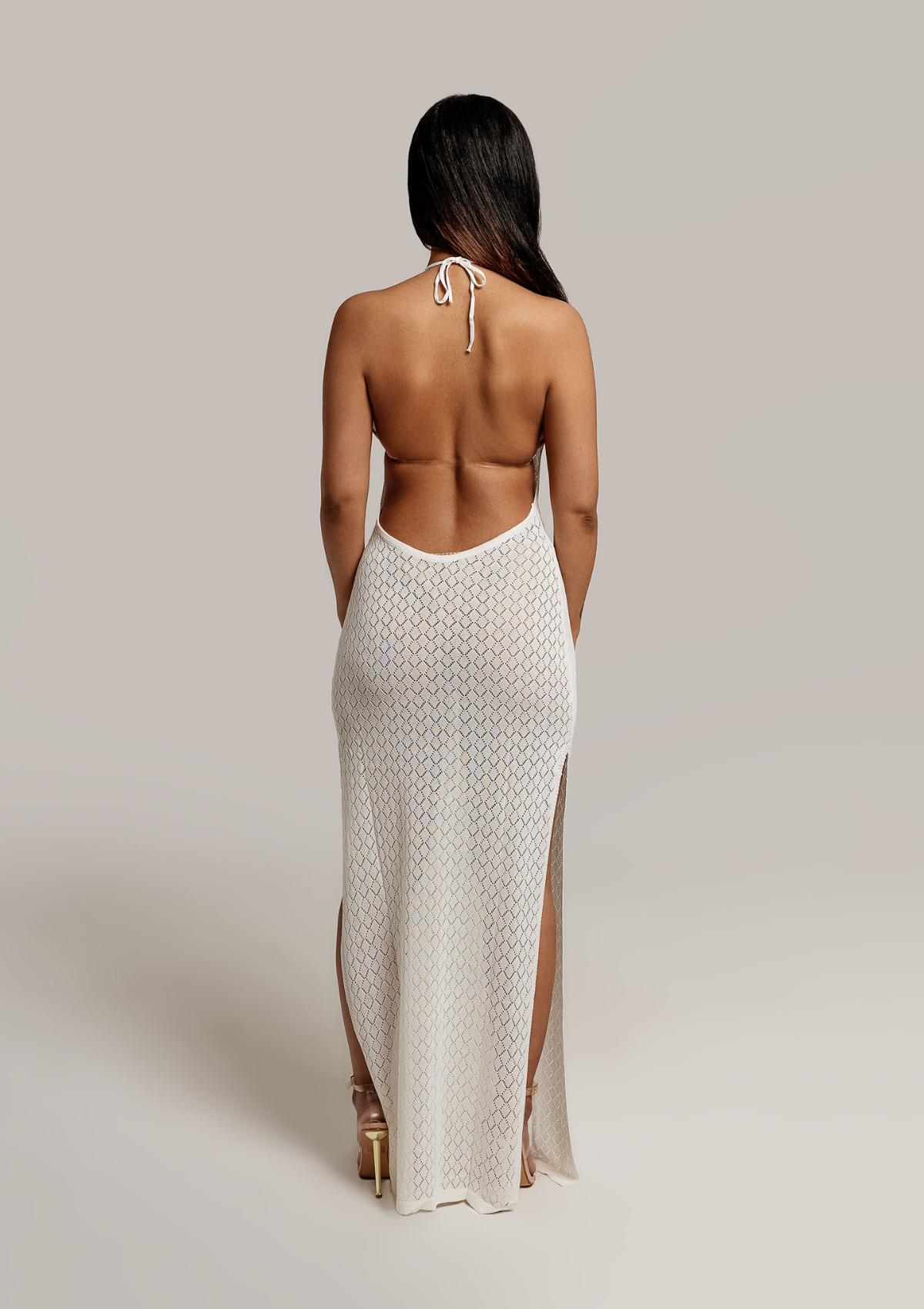 Sultry in the sun, the ‘White Selena Textured Knit Backless Cover Up Dress' is a minimalistic and elegant addition to your resort wear collection. Made from beautifully soft knit, this style drapes over the body perfectly. This sundress is versatile enough to pair with your favourite nude bikini or form fitting one piece. Beautiful halter cut with a delicate tie around the neck. Glamorous slit on both sides to accentuate the leg.
